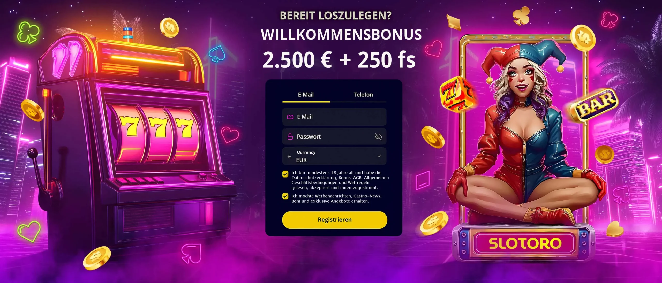 Die Kontoerstellung in unserem Slotoro Online Casino ist mit wenigen Klicks sehr einfach durchzuführen. Einfach das Casino aufrufen und auf der Startseite den Button “Anmelden” anklicken.